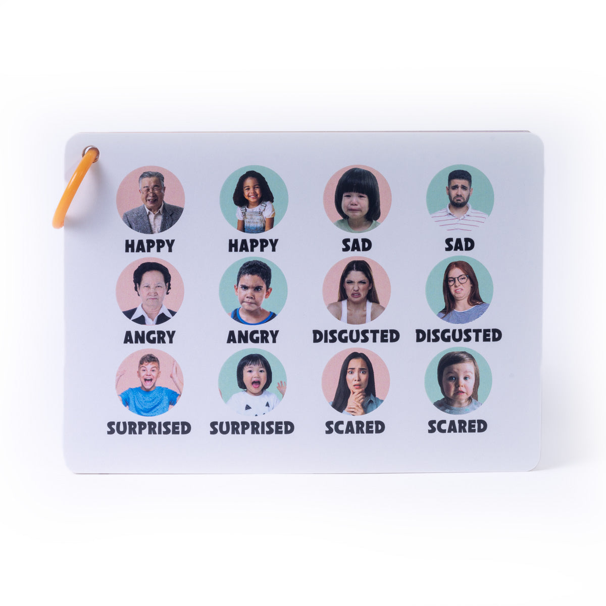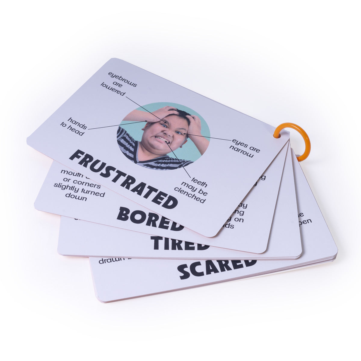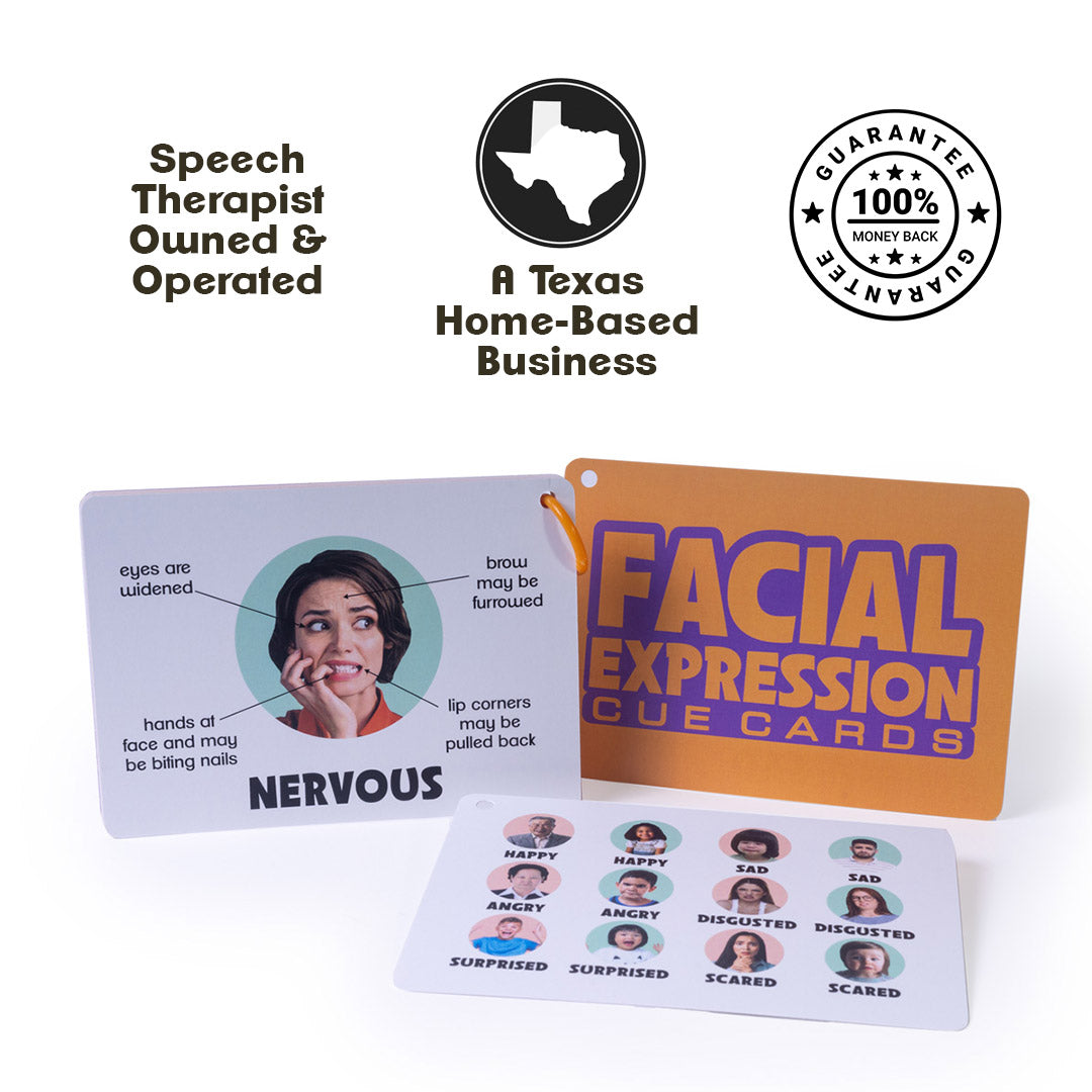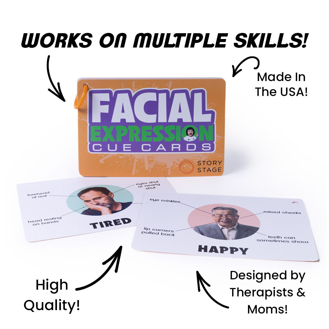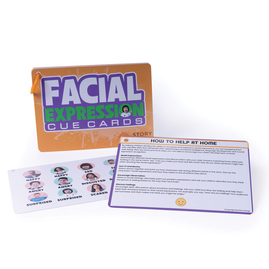 Facial Expression Cue Cards are the only cards designed to help children and adults recognize and understand emotions through specifically defined facial cues. Created by experienced therapists, these larger sized 5x7-inch cards feature real photos (not cartoons) showcasing a diverse range of individuals to ensure inclusivity and relatability.